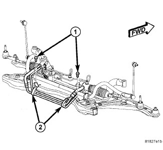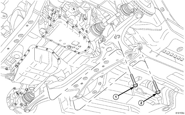 15. Remove the crossmember bolts (1 and 2) and lower the crossmember from the vehicle.