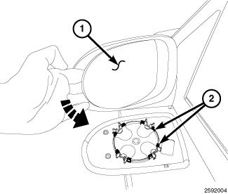 1. Move the mirror glass assembly (1) inward and reach behind the glass with fingers.