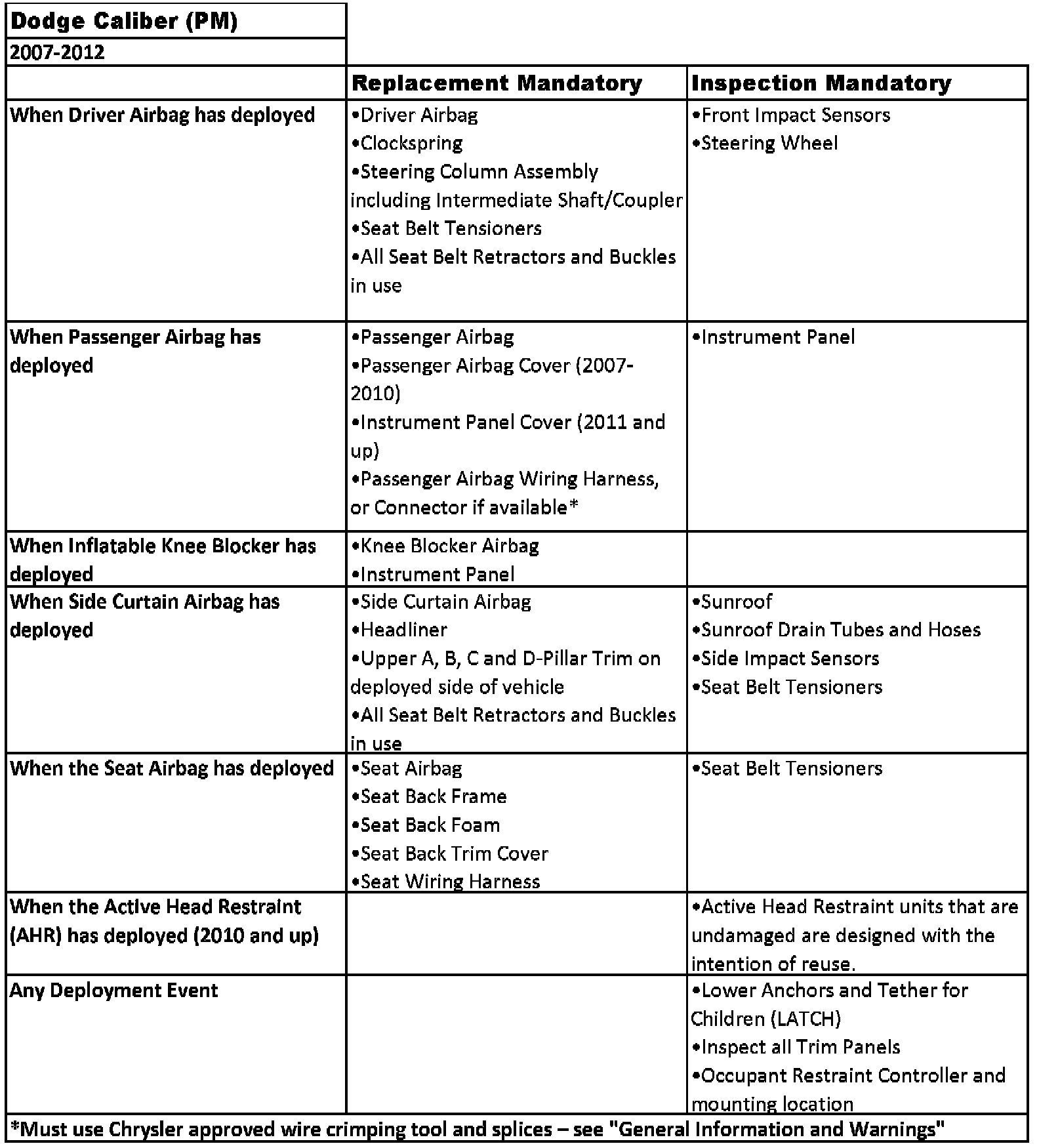 NOTE: Any vehicle which is to be returned to use following an SRS component deployment must have the deployed restraints replaced. All other vehicle components should be closely inspected following any SRS component deployment, but are to be replaced only as required by the extent of the visible damage incurred.