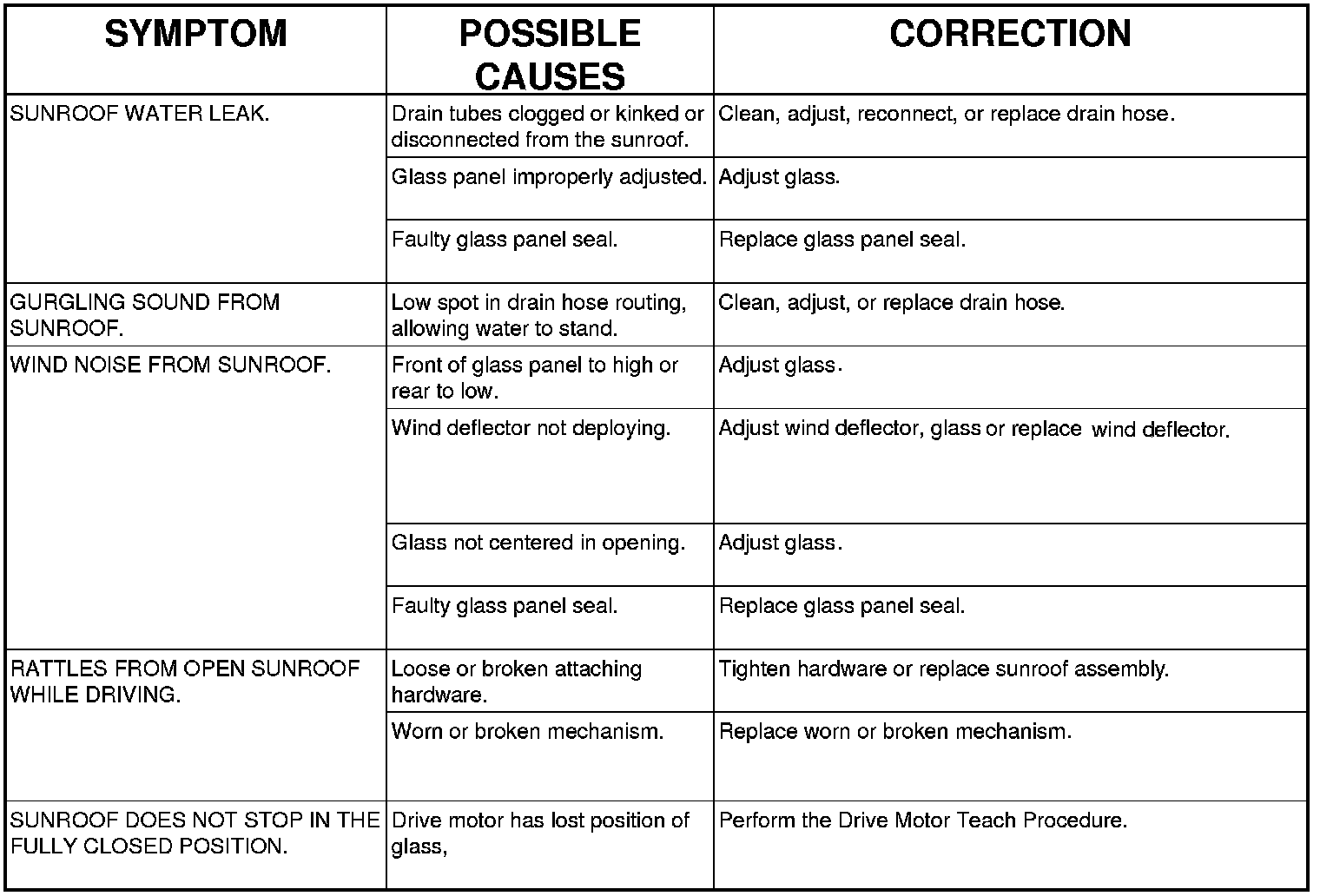 Before beginning diagnosis for wind noise or water leaks, verify that the problem was not caused by releasing the control switch before the sunroof was fully closed. The sunroof module has a water-management system. If however, the sunroof glass is in a partial closed position, high pressure water may be forced beyond the water management system boundaries and onto the headlining.