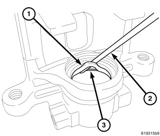 9. Using a soft tool such as a plastic trim stick (2), work the piston seal (1) out of its groove (3) in the caliper piston bore. Discard the used seal.