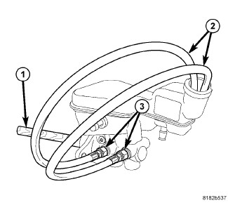 a. Thread Bleeder Tube Adapter (1) into the primary outlet port of the master cylinder without a proportioning valve. Tighten Adapter to 17 Nm (150 in. lbs.).