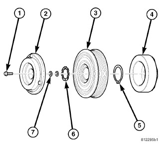 On 2.2L diesel engine equipped models, the clutch assembly for the Denso fixed displacement A/C compressor consists of a stationary electromagnetic A/C clutch coil (4), pulley bearing and pulley assembly (3), clutch plate (2) and shims (7). These components provide the means to engage and disengage the A/C compressor from the engine accessory drive belt.