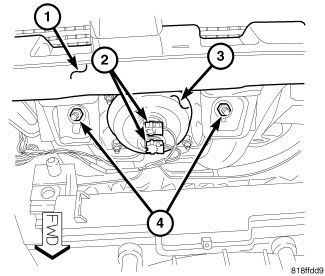 8. Reach through and above the instrument panel upper glove box opening to install and tighten the two nuts (4) that secure the PAB lower bracket studs to the instrument panel structural support. Tighten the nuts to 6 Nm (55 in. lbs.).