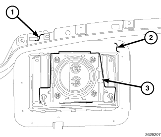 2. Carefully position the Passenger AirBag (PAB) housing (3) to the airbag retainer receptacle. The side of the housing with 8 hooks faces the defroster duct outlet or forward in the vehicle.