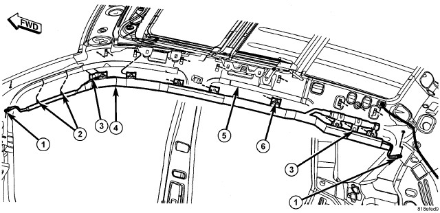 4. Install and tighten the seven screws (6) that secure the side curtain airbag to the U-nuts in the inner roof side rail. Tighten the screws to 5.5 Nm (50 in. lbs.).