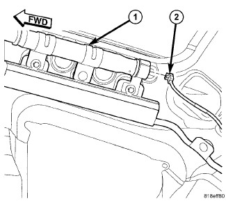 8. Reconnect the body wire harness connector (2) for the side curtain airbag to the connector receptacle at the back of the inflator (1) on the inner roof side rail between the C and D-pillars.