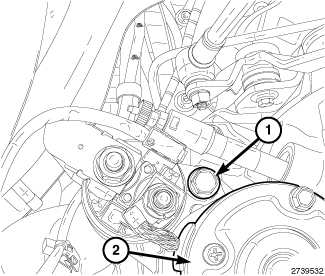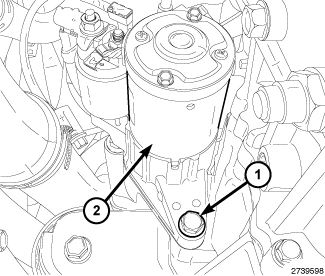 1. Install the lower starter mounting bolt (1) and remove the starter (2).