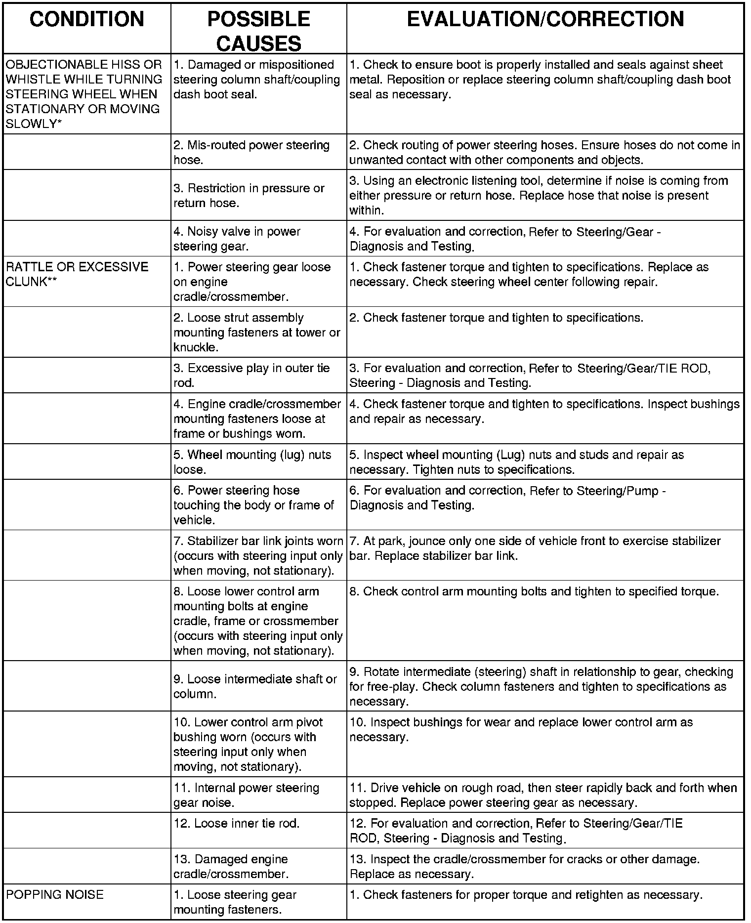 NOTE: ** A light clunk may be felt or heard during steering wheel reversal while vehicle is stationary. This results from internal steering gear rack movement at the bushings and in no way affects the performance of the steering system. This movement may be felt in the steering components during steering wheel reversal.