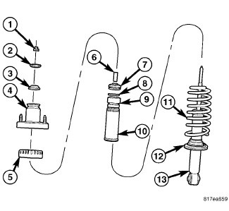 8. Install the shock absorber (13) up through the bottom of the coil spring and upper mounting bracket until the lower spring seat contacts the lower end of the coil spring.