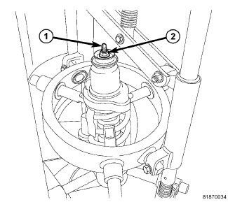 10. Install Snap-On(R) Shock Absorber Socket A139, or equivalent, on the end of the shock rod (1). While holding the shock rod from turning, tighten the nut (2) using a crows foot wrench and a torque wrench. Tighten the shock rod nut to 24 Nm (18 ft. lbs.).