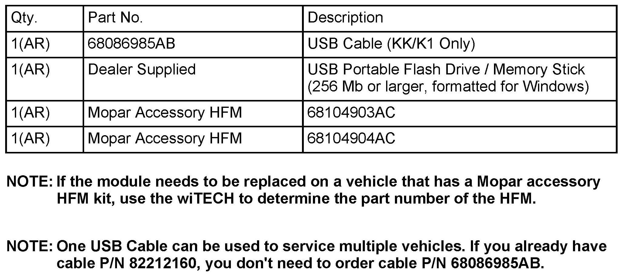 This Bulletin involves performing a USB flash or based on the diagnosis, replacing the Mopar accessory Hands Free Module (HFM).