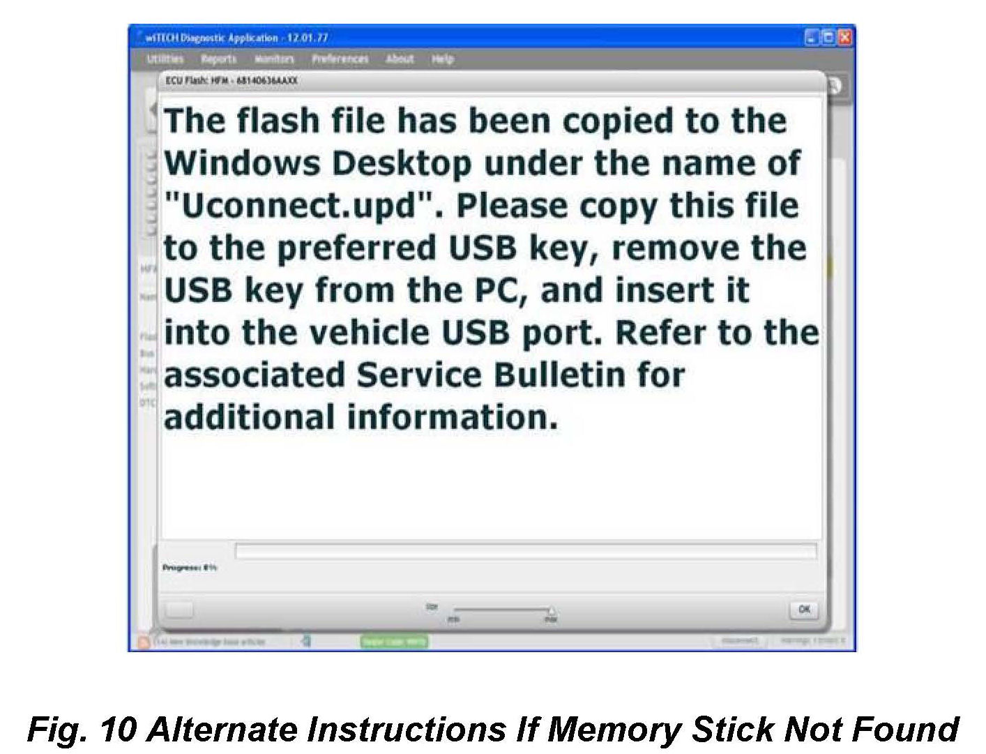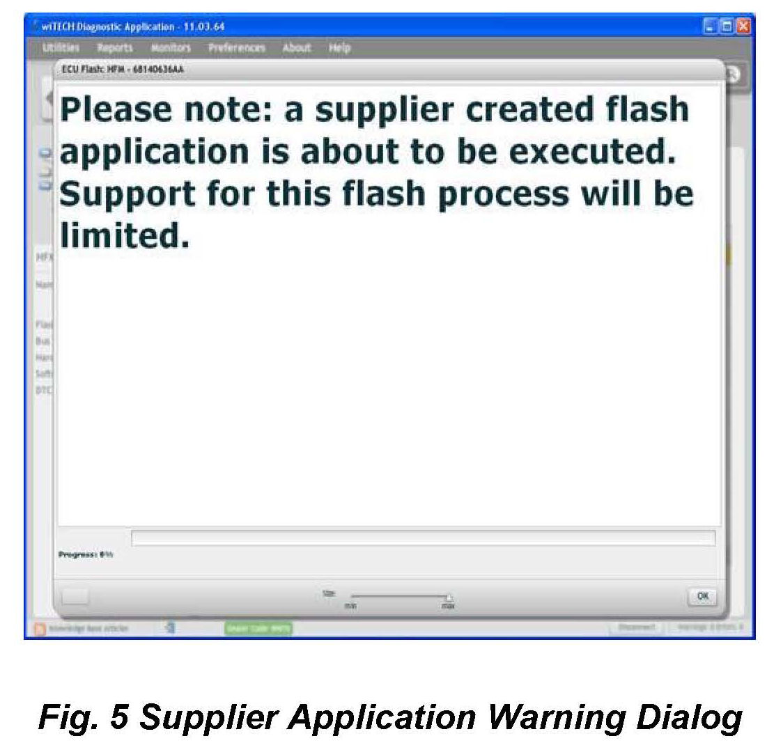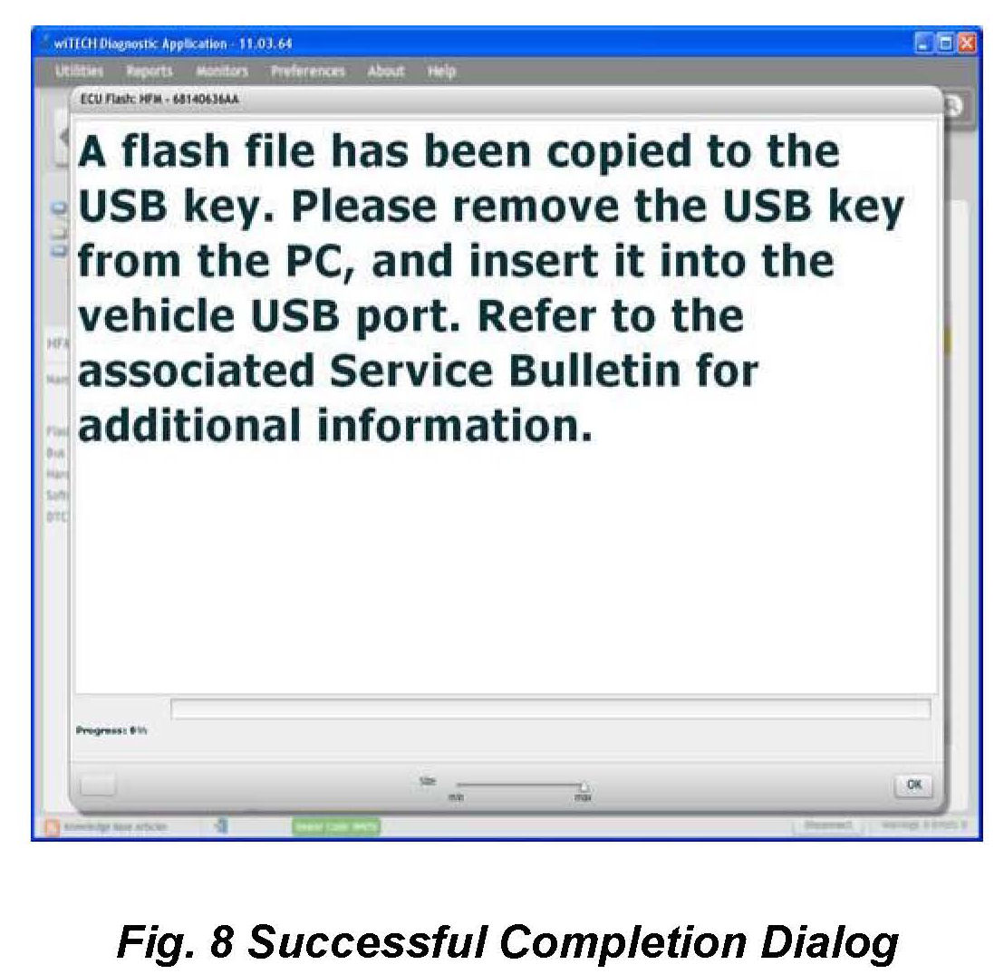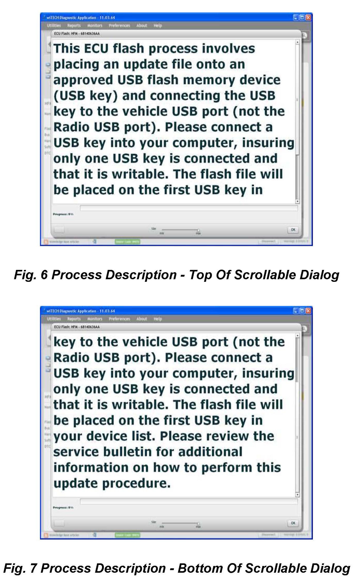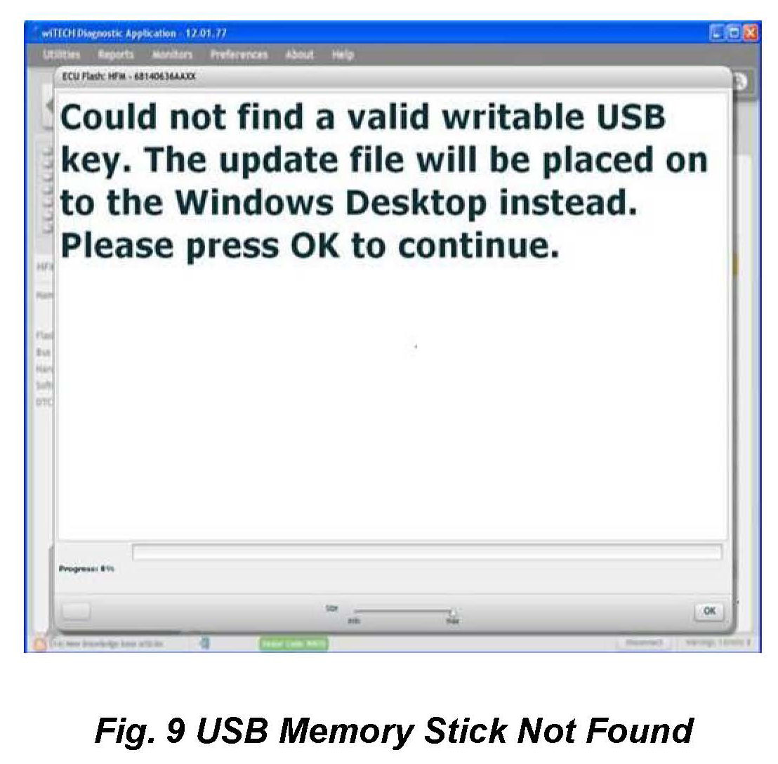 10. A scrollable Process Description Dialog will appear (Fig. 6) and (Fig. 7). Insert the dealer supplied USB memory stick into the first USB port of the wiTECH computer at this time. Ensure that no other USB memory sticks are installed, and click on OK to acknowledge the instructions.