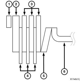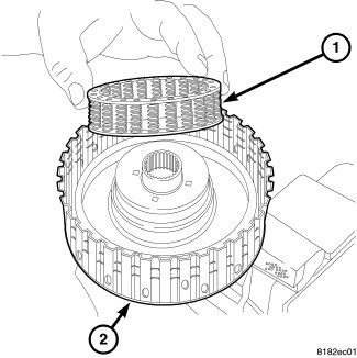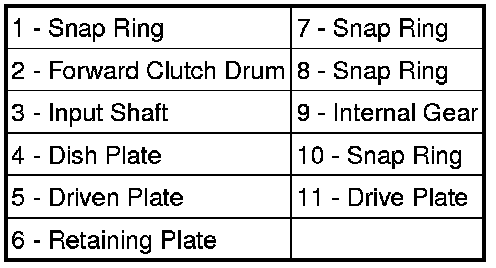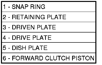 9. Install the dish plate (5), the driven plate (3), the drive plate (4), the retaining plate (2) and one piece of the snap ring (1), in the forward clutch piston (6).