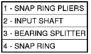 1. Install Bearing Splitter (3)(Figure 2) behind 5th speed gear. Remove snap ring (4) at 5th synchronizer hub on input shaft (2).