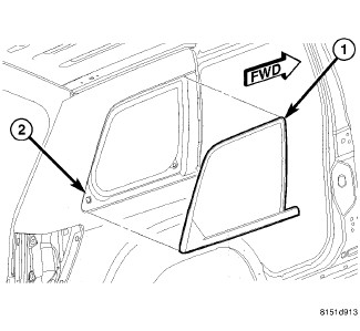 14. Place the quarter glass (1) into the window opening (2) and insert mounting studs through the holes in the window fence.