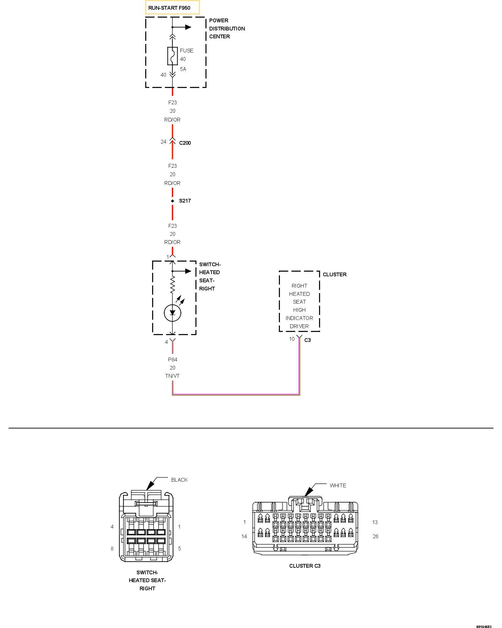 3. Measure the Voltage of the (F23) Fused Run/Start Relay Output circuit between the Right Heated Seat Switch connector and ground.