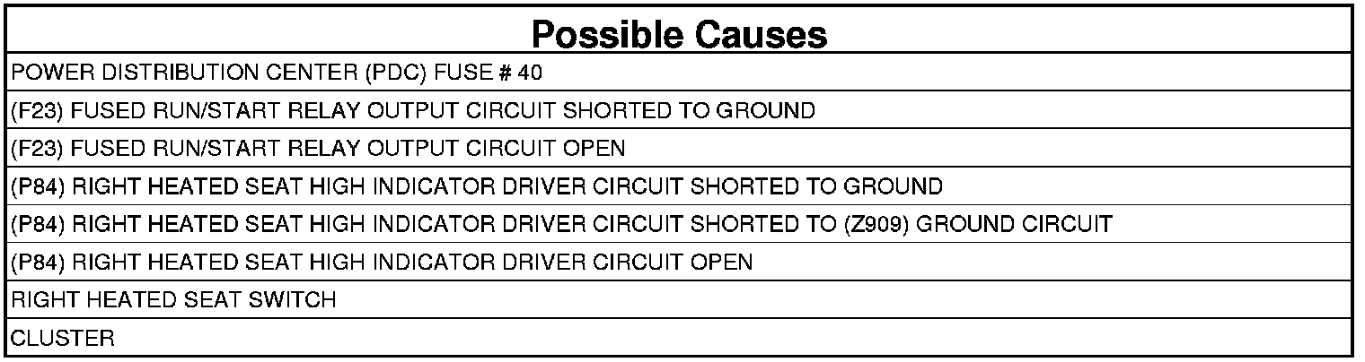 - Repair the (P84) Right Heated Seat High Indicator Driver circuit for a short to the (Z909) Ground circuit.