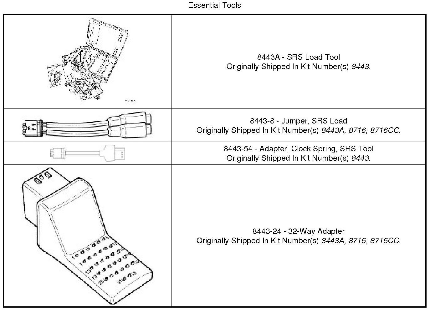 When powered, the Occupant Restraint Controller (ORC) sends a test current to the squibs to verify the integrity of the squib and wiring. These circuits are maintained in a "floating" configuration at the module (connected to neither power nor ground) as protection against inadvertent deployment. Use of the (8443A) in the tests below substitutes a suspect squib with a known good component. The use of the SRS Load Tool Adaptor provides a test point as well as a method for opening the shorting bar connections within the harness connector. The Clockspring is part of the Steering Column Control Module (SCCM). The SCCM includes the steering column shroud, the Steering Angle Sensor (SAS), the Clockspring, the Multi-function Switch, a Steering Column Power Tilt and Telescope Switch (if equipped), and a trim cover. The SCCM is replaced as an entire assembly.
