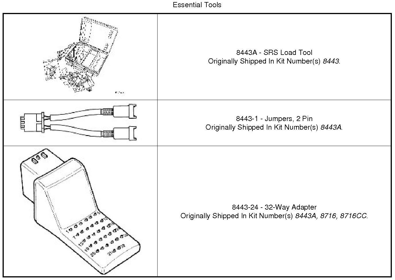 When powered, the Occupant Restraint Controller (ORC) sends a test current to the squibs to verify the integrity of the squib and wiring. These circuits are maintained in a "floating" configuration at the module (connected to neither power nor ground) as protection against inadvertent deployment. Use of the load tool in the tests below substitutes a suspect squib with a known good component. The use of the ORC connector adapter tool provides a test point as well as a method for opening the shorting bar connections within the harness connector.