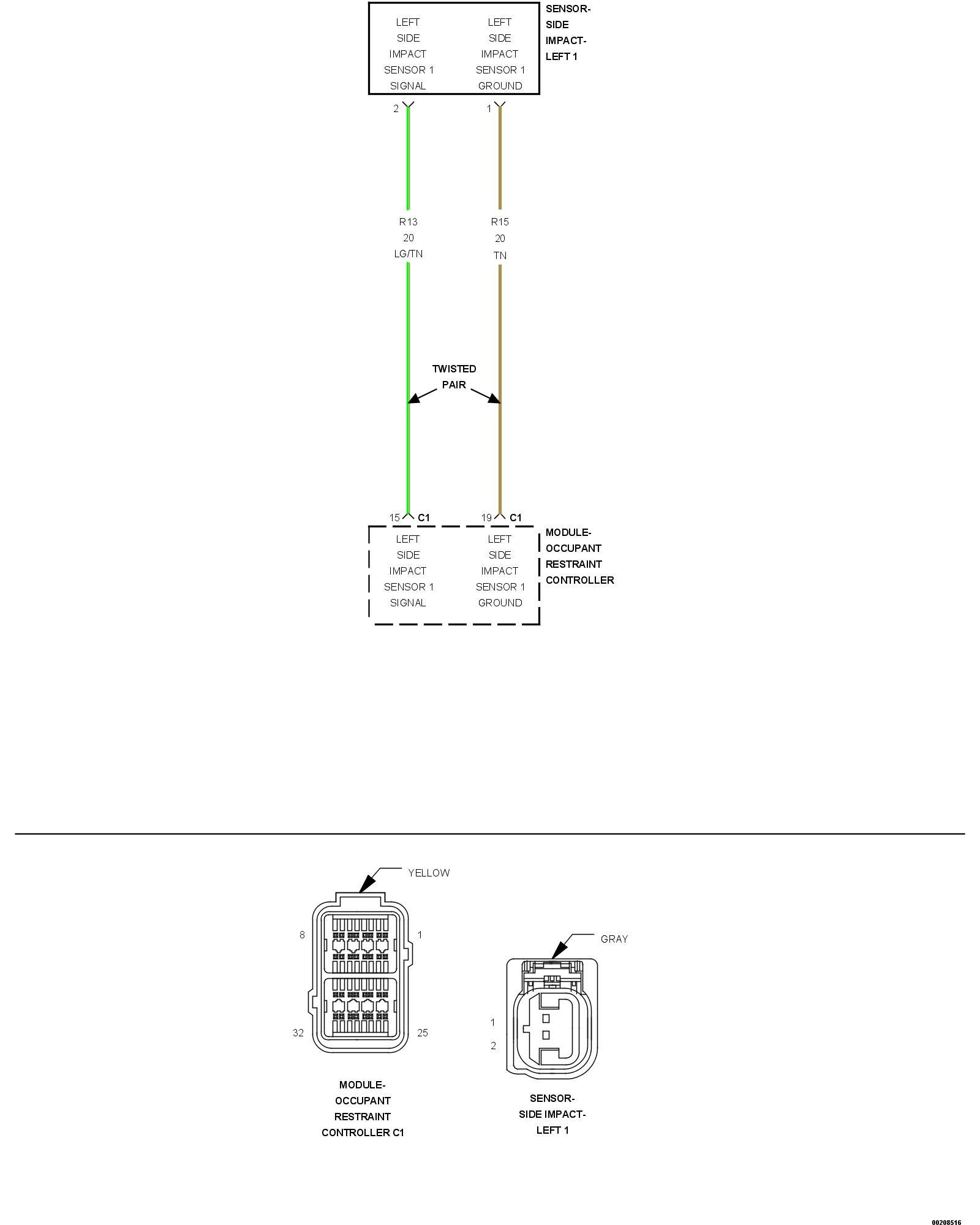 - Repair the (R13, R15) Left Side Impact Sensor 1 circuits shorted together.