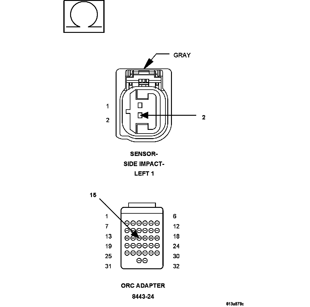 1. Measure the resistance between the (R13) Left Side Impact Sensor 1 Signal and (R15) Sensor Ground circuits at the Left Side Impact Sensor 1 connector.