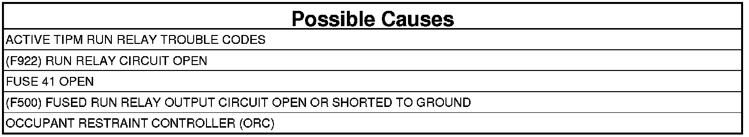 - Repair the (F500) Fused Run Relay Output circuit for a short to ground.