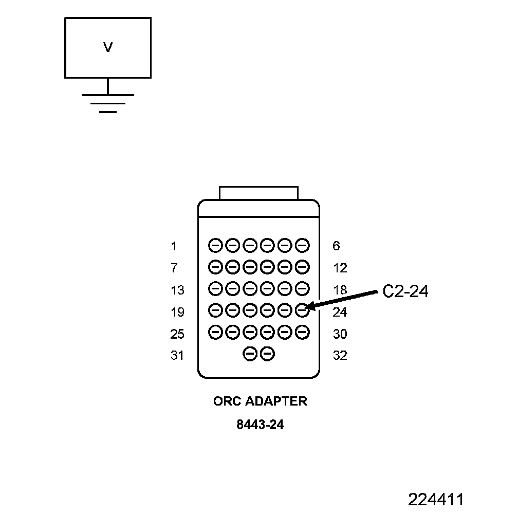 4. Measure the voltage of the (F500) Fused Run Relay Output Circuit between the (8443-24) cavity C2-24 and ground.