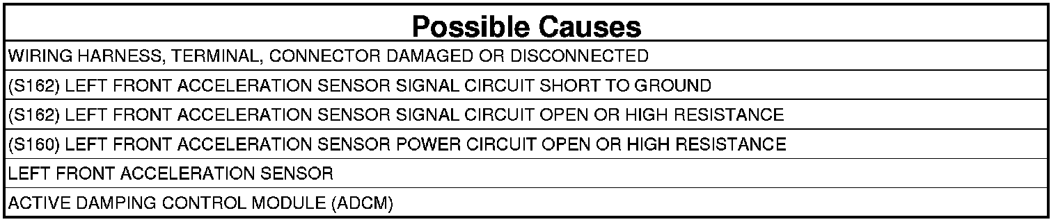 - Repair the (S162) Left Front Acceleration Sensor Signal circuit for a short ground.