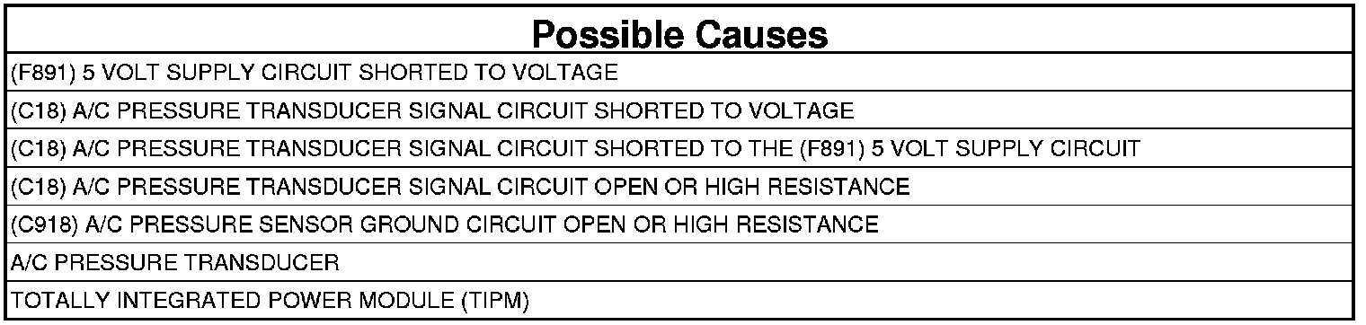 - Repair the short between the (C18) A/C Pressure Transducer Signal circuit and the (F891) 5-volt Supply circuit.