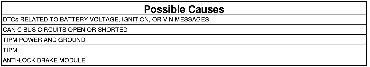 If the Anti-Lock Brake Module either fails to receive bus messages from the Totally Integrated power Module (TIPM) for approximately 500 ms, or it receives invalid messages from the TIPM, or it detects messages from the TIPM are of improper data length.