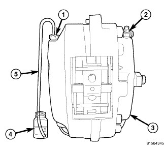8. Attach a clear hose (5) to the outboard bleeder screw (1) at the brake caliper and feed the other end of hose into a clear jar (4) containing enough fresh brake fluid to submerge the end of the hose.