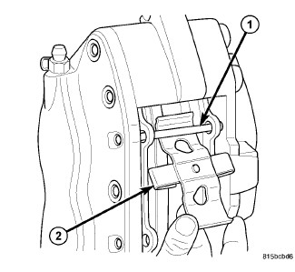5. Install upper end of brake pad spring clip (2) under upper brake pad support pin (1).