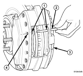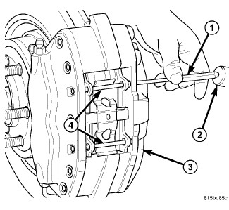 9. From inboard side, seat upper and lower support pins (4) into caliper (3) using pin punch (1) and hammer (2). Support pins must be driven into caliper until support pin retaining rings are locked into place.