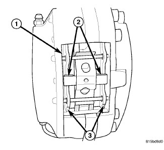 10. Once support pins are fully installed into caliper, inspect assembled caliper to make sure spring clip (2) is centered in opening (1) of caliper, correctly engaging upper and lower support pins, and is resting against both brake pads (3).