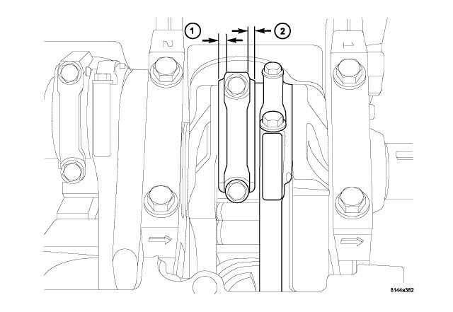 20. If required, measure the connecting rod side clearance (1,2) Engine Specifications.