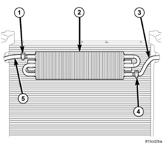 3. Slide return hose from gear (5) onto inlet of cooler (2). Install clamp (1) securing hose in place.
