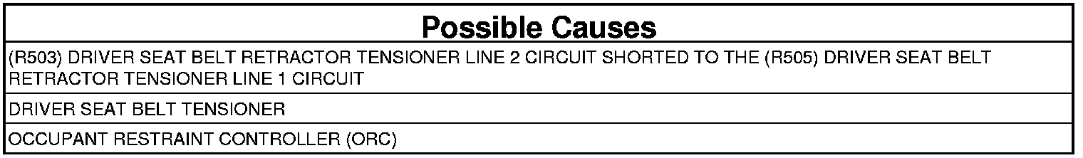 - Repair or replace the (R505) Driver Seat Belt Retractor Tensioner Line 1 circuit for a short to the (R503) Driver Seat Belt Retractor Tensioner Line 2 circuit.