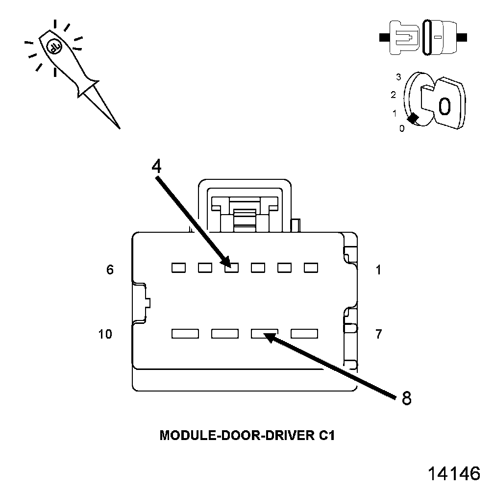 2. Test both of the (A937) Fused B(+) circuits for high resistance by connecting a 12-volt test light between the (A937) Fused B(+) circuits and the (Z912) Ground circuit in the Door Module connector. The test light must illuminate brightly. Compare the brightness to that of a direct connection to the battery.