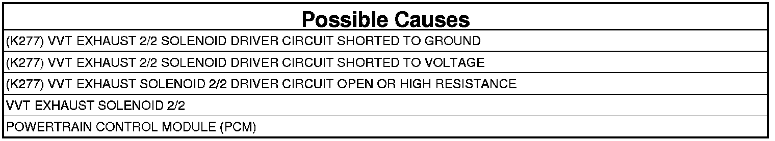 - Repair the (K277) VVT Exhaust Solenoid 2/2 Driver circuit for a short to voltage.