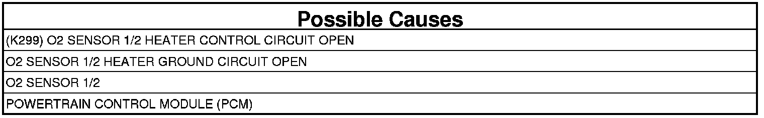 - Repair the excessive resistance in the (K299) O2 Sensor 1/2 Heater Control circuit.