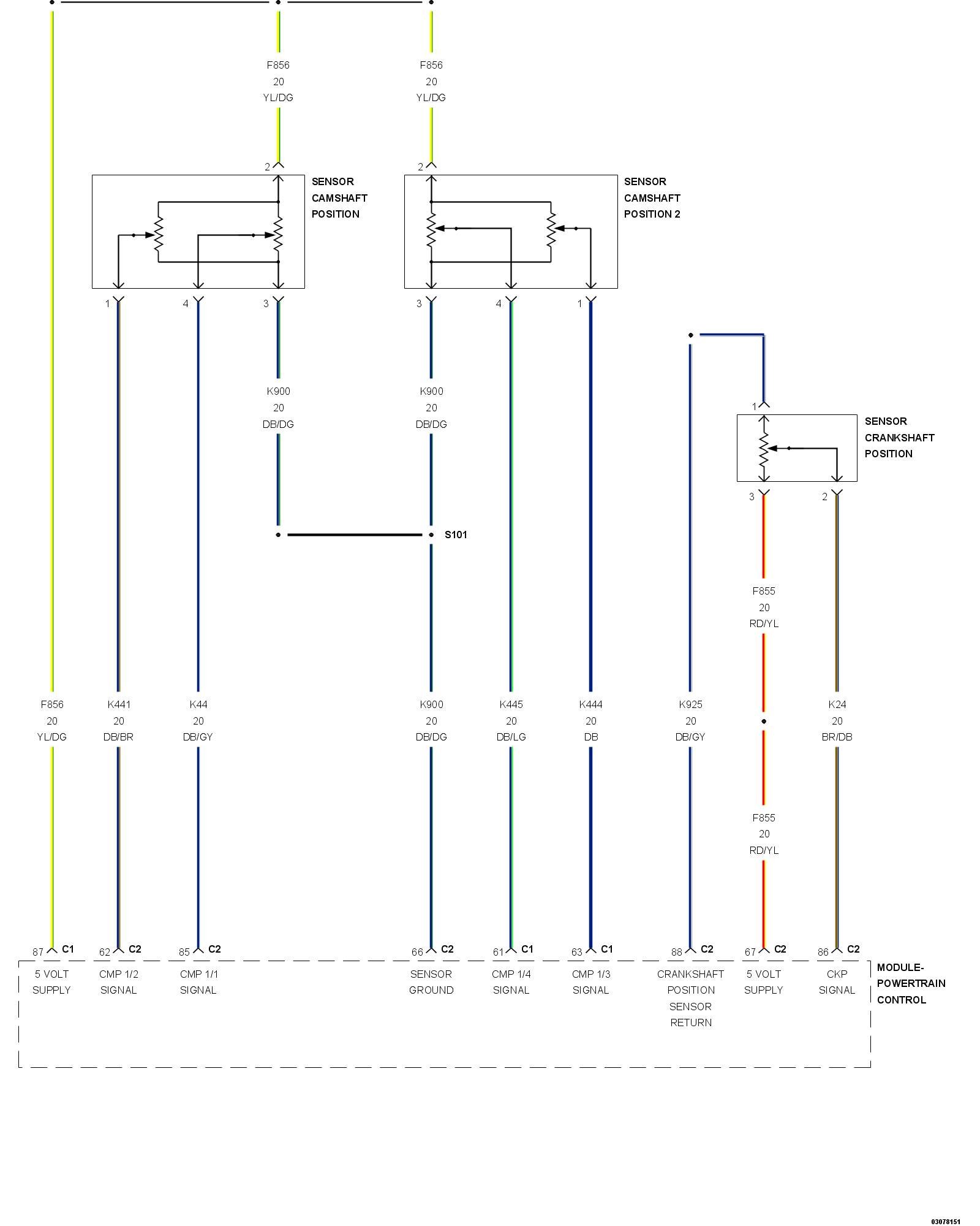 - Repair the short between the (F856) 5-Volt Supply circuit and the (K44) CMP Sensor Signal 1/1 circuit.