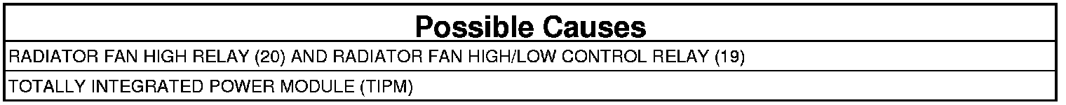 The Powertrain Control Module (PCM) requests the Totally Integrated Power Module (TIPM) to turn on the radiator fan and it is not operating. The TIPM detects an open in the coil control circuit of both the radiator fan high relay (20) and radiator fan high/low control relay (19). One trip fault. Three good trips to turn off the Malfunction Indicator Lamp (MIL).