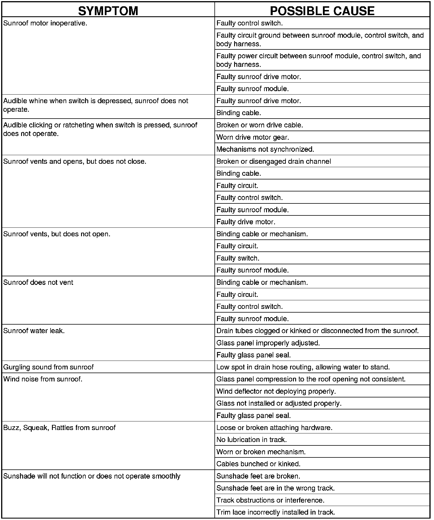 SUNROOF DIAGNOSIS CHART