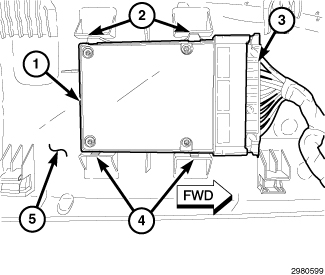 2. Position the power seat switch to the seat cushion side trim panel (5) and engage the four retaining tabs (2 and 4) that secure the switch to the trim panel. Make sure the retaining tabs are fully engaged.