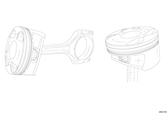 The pistons are a lightweight design with ultra low tension piston rings for improved fuel economy. The pistons are made of a high strength aluminum alloy and the piston skirt has a Moly(R) coating. The top piston ring land has an anodized coating for improved wear. The piston is connected to the rod using a full floating pin with two locking clips. The connecting rod is forged steel with a bolted cracked cap design. The connecting rod bolts are not reusable. Pistons are available in two different diameters with grade markings for each bore indicated on the side of the cylinder block. The upper compression ring is a 1.2 mm steel ring with a spray coating. The intermediate compression ring is 1.2 mm micro napier design. Both compression rings have a dot or a mark on the piston ring. The marked side of the ring must face the top of the piston. The 2 mm three piece oil control ring is very thin. These are chrome plated rings and have a stainless steel expander.
