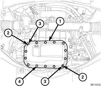 2. Apply a 2 to 3 mm wide bead of Mopar(R) Threebond Engine RTV Sealant (1) to the lower oil pan as shown.