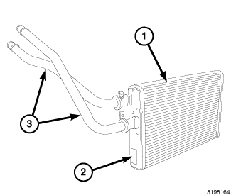 The heater core (1) is mounted into the left side of the air distribution housing, which is located behind the instrument panel. The heater core is a heat exchanger made of rows of tubes with fins. The heater core is positioned within the air distribution housing so that only the selected amount of air entering the housing passes through the heater core, before being distributed through the heating and A/C system ducts and outlets. One end of the heater core has a tank (2) that includes fittings for the heater core tubes (3).