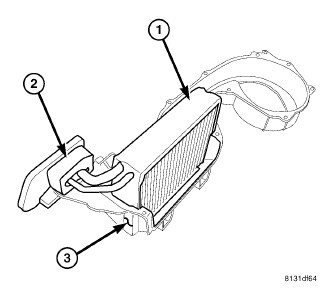9. Carefully lift the A/C evaporator (1) and foam seal (2) out of the lower half of the HVAC housing (3).