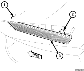1. Position the front side marker lamp (3) close enough to the mounting hole in the front fascia (1) to access and reinstall the lamp bulb and socket.